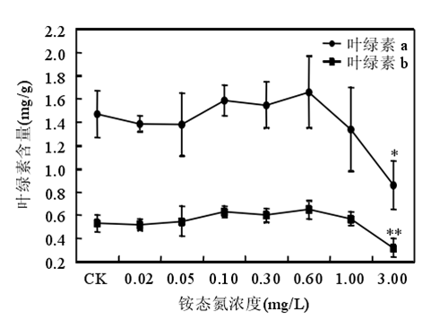 銨態(tài)氮濃度低于 0.60mg/時苦草生長良好,濃度大于或等于 1.00mg/L 時苦草的光合能力受到抑制、代謝受到干擾。苦草對銨態(tài)氮最敏感的生理生化指標是葉片中游離氨基酸態(tài)氮含量。銨態(tài)氮作為沉水植物的一種營養(yǎng)物質(zhì),當其含量較低時,植物由于營養(yǎng)缺乏誘導(dǎo)產(chǎn)生自由基。