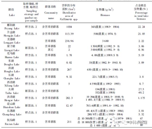 在很多湖泊植被調(diào)查工作中都對苦草群落或含苦草的群落生物量進行了測定(見下圖)。從表中可以看出,最高和最低生物量之間存在上千倍的差異。這一方面是因為調(diào)查對象尚包括其它種類,而非苦草本身; 另一方面,也是由于調(diào)查方法本身所致: