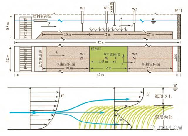 (1) 冠層以上,水流不受苦草冠層的影響,時均流速呈對數(shù)分布; 冠層內(nèi)部,由于冠層阻流面積在垂線分布上存在差異,冠層內(nèi)時均流速呈逆梯度分布,且在床面附近出現(xiàn)局部流速最大值。